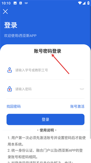 1、打開應用先進入登錄界面,選擇賬號密碼登錄,輸入學號或教職工號和密碼,首次使用需先激活賬號并設置密碼才能進入應用。