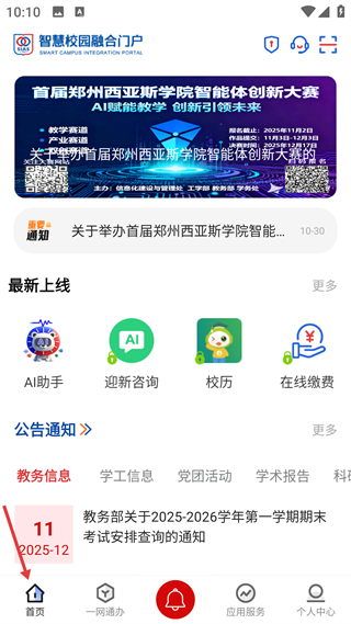 2、進入后看到首頁界面,有賽事宣傳和最新上線功能,底部有首頁一網通辦等按鈕,可查看公告通知里的各類校園相關信息。