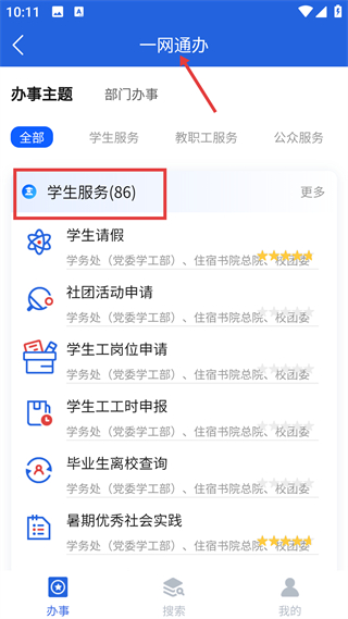 3、點擊一網通辦進入對應界面,選擇學生服務分類,能看到學生請假社團活動申請等多項服務,可根據自身需求選擇對應功能。