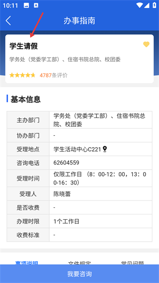 4、選擇學生請假進入辦事指南,可查看主辦部門受理地點咨詢電話等信息,了解受理時間和辦理時限后按流程操作。