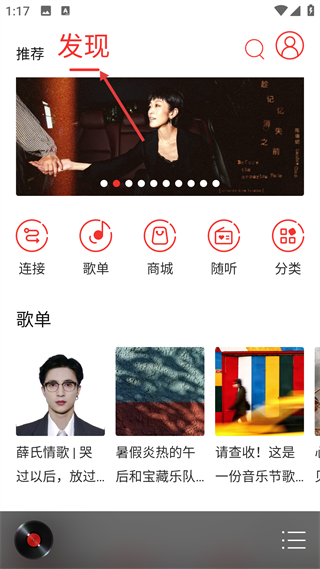 1、發現頁設推薦與發現標簽,展示banner及連接、歌單等功能入口,含歌單推薦,是音樂資源的綜合瀏覽界面。