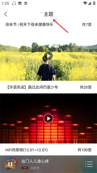 3、主題頁展示各類主題歌單,標注歌單內歌曲數量,支持播放操作,是按主題分類瀏覽音樂的板塊。