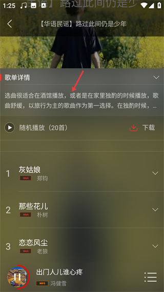 4、歌單詳情頁展示歌單介紹,提供隨機播放、下載功能,列出歌曲列表,是歌單內容的具體展示界面。