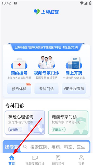 1、進入首頁界面,可使用預約掛號、視頻專家門診、網上開藥等功能,還有預約體檢、??崎T診、VIP全程看病等服務入口。