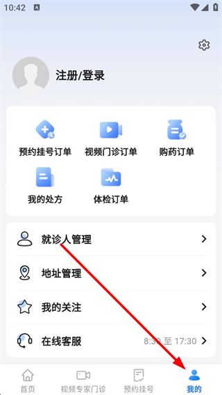 2、點擊我的選項,進入個人界面,可進行注冊、登錄,查看預約掛號訂單、視頻門診訂單、購藥訂單等,還有就診人管理、地址管理、我的關注、在線客服等功能。