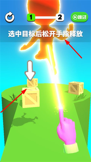1、看到提示選擇目標后松開手指釋放,操作手指選擇場景里的木箱,松開手指即可釋放人偶彈射向木箱,推進關卡進程。