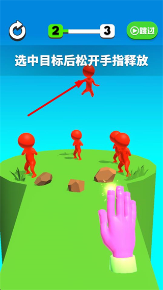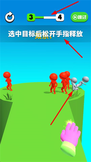 3、后續的關卡同樣遵循選擇目標后松開手指釋放的規則,操作手指選擇場景里的紅色人偶,松開手指讓彈射的人偶墜落。