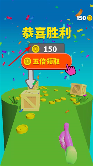2、完成關卡后會出現恭喜勝利界面,顯示獲得150金幣,還有五倍領取按鈕,點擊該按鈕可獲得更多金幣,提升游戲資源儲備。