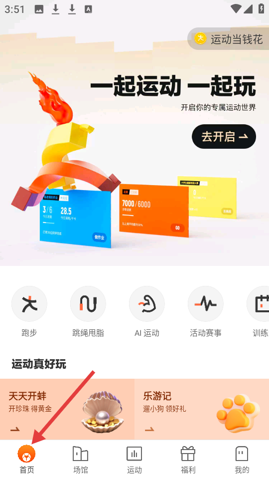 1、首頁主打一起運動一起玩,設跑步等運動功能鍵,并有運動當錢花等趣味玩法激勵開啟專屬運動之旅。