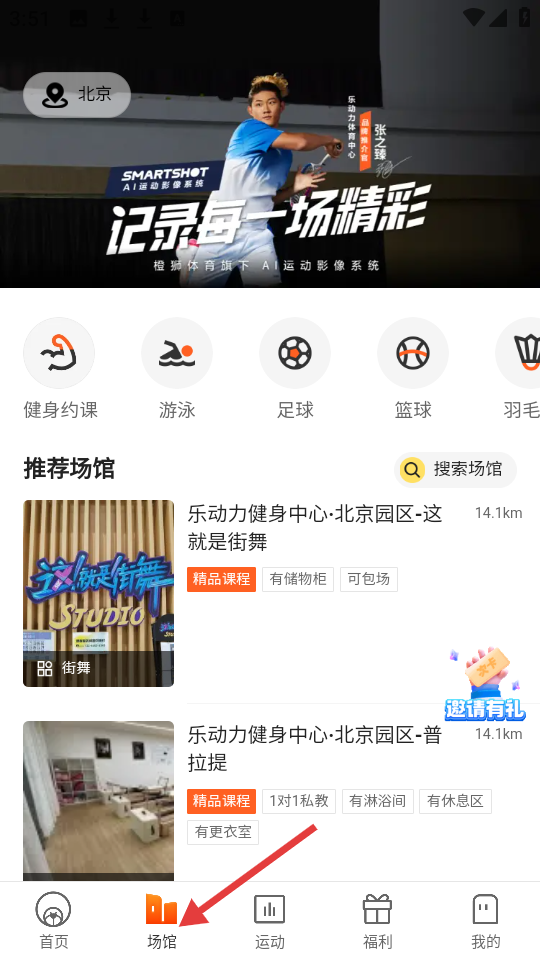 2、場館界面定位北京呈現健身約課等項目,推薦樂動力健身中心等場館,標注距離與設施助用戶便捷找運動場地。