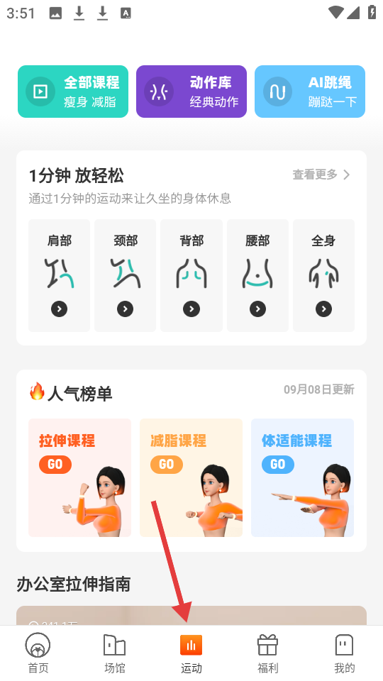3、運動頁面含全部課程等板塊,1分鐘放輕松可快速放松,人氣榜單展示熱門課程為運動計劃提供多樣選擇。