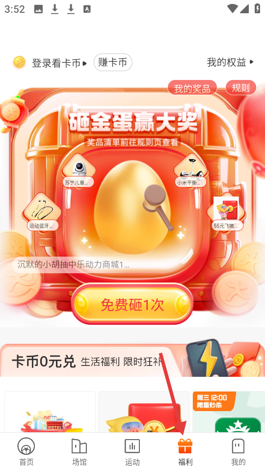 4、福利頁面以砸金蛋贏大獎吸睛展示豐厚獎品,還能賺卡幣兌福利,限時秒殺增添互動性與趣味性。