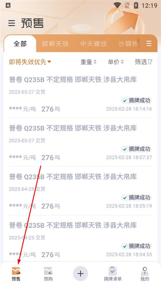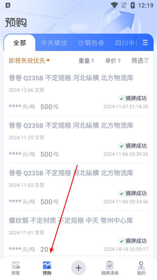 1、打開軟件進入預售頁面,瀏覽各類物資的發貨時間重量等內容,查看已完成的摘牌記錄,了解物資的交易進度與狀態。
