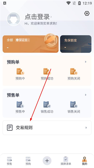 3、進入我的頁面查看預購單和預售單的不同狀態,找到交易規則選項,點擊即可查看平臺相關的交易規范。
