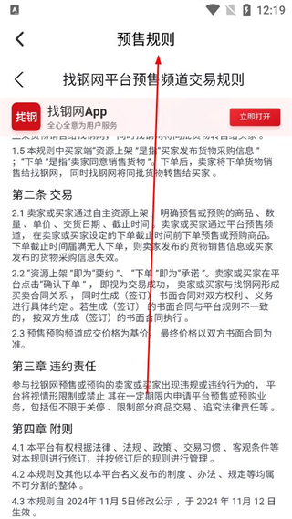 4、在交易規則頁面閱讀找鋼網平臺預售頻道的交易規則,了解交易雙方的權利義務,明確違約相關責任及附則內容,掌握平臺交易的各項規范要求。