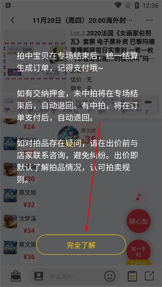 4、在拍賣界面查看拍品信息及出價規則,點擊完全了解按鈕確認知曉規則,即可參與拍品的出價等拍賣。
