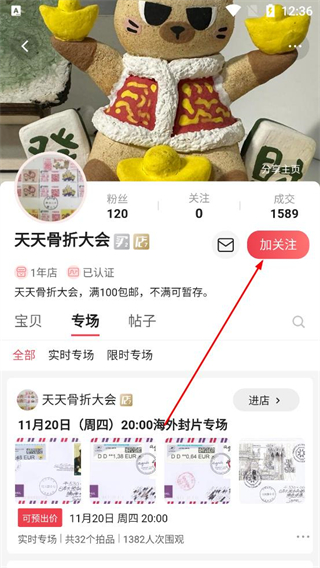 2、在店鋪頁面查看粉絲數等信息,點擊加關注按鈕關注該店鋪,瀏覽專場信息,準備參與對應的拍賣活動。
