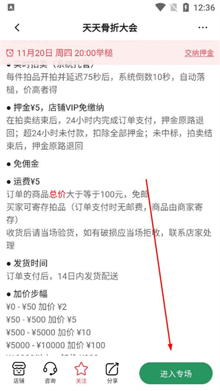 3、進入天天骨折大會專場規則頁面,查看押金運費等拍賣規則,確認信息后點擊進入專場按鈕,進入拍賣活動界面。