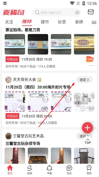 1、進入麥稀奇app,瀏覽推薦板塊的拍賣專場,選擇天天骨折大會的海外封片專場,點擊進店按鈕進入該店鋪的詳情頁面。