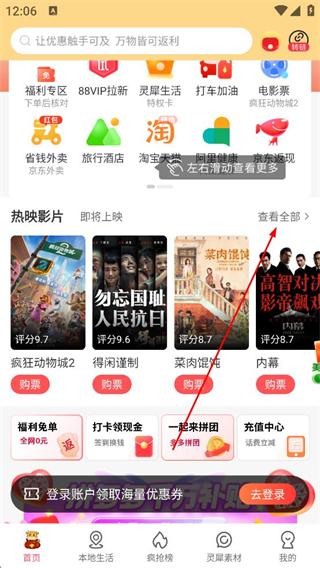 1、打開軟件進入首頁,在熱映影片板塊點擊查看全部,進入電影列表頁面,瀏覽正在熱映的影片內容。