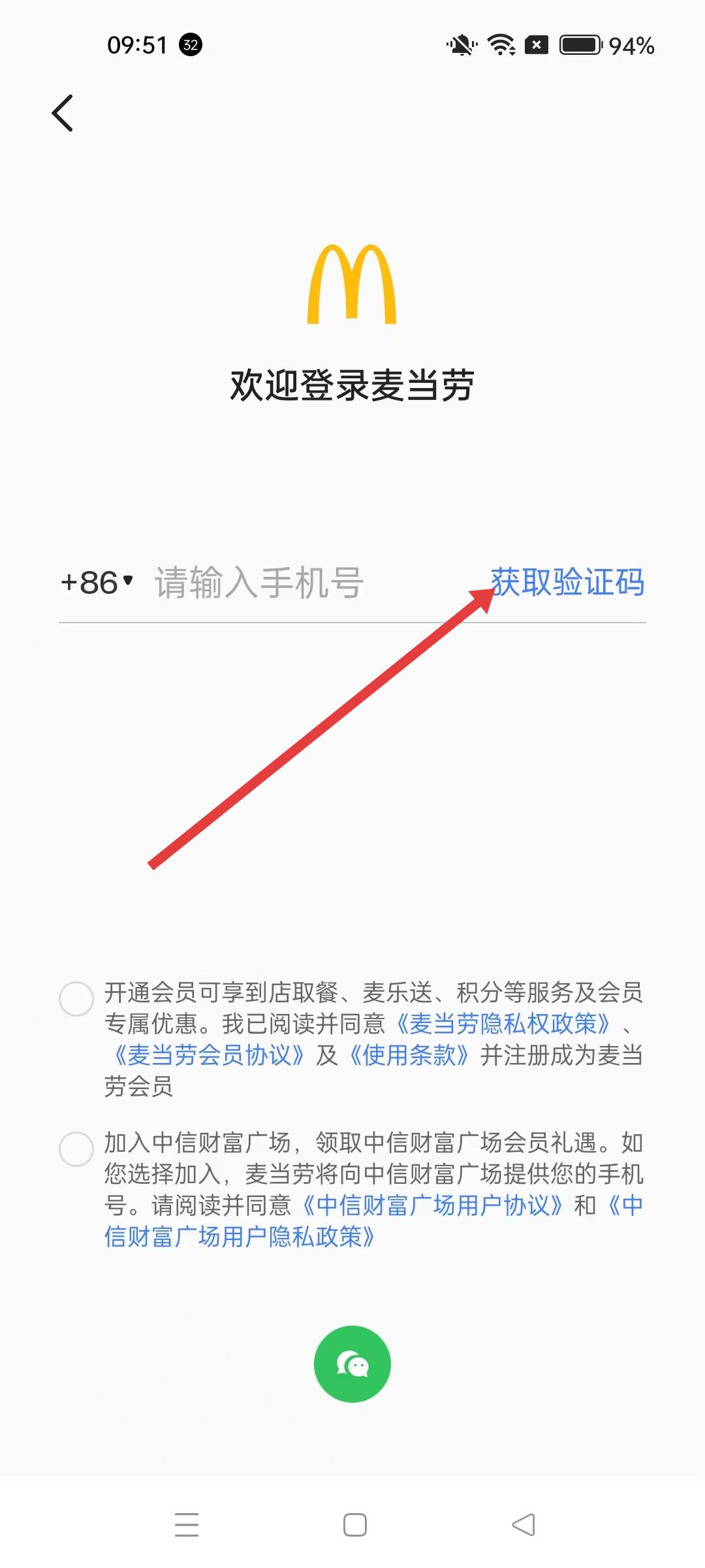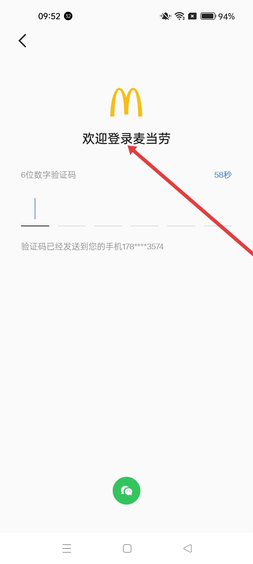4、驗證碼輸入界面,輸入收到的6位數字驗證碼,即可完成麥當勞APP的登錄操作,登錄后可享受會員優惠、點餐等服務。