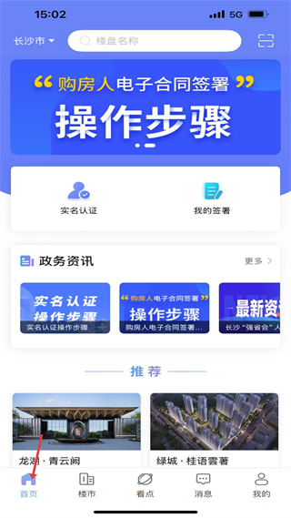 1、首頁定位長沙市,有搜索欄,展示購房合同簽署步驟,涵蓋政務資訊及龍湖、綠城樓盤,提供樓市政務及樓盤信息。