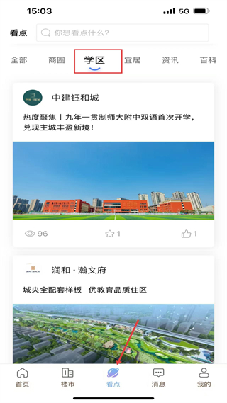 3、看點有搜索欄,涵蓋商圈、學區等分類,展示中.信城開萬科等樓盤資訊,標注瀏覽數,提供樓市熱點解讀。