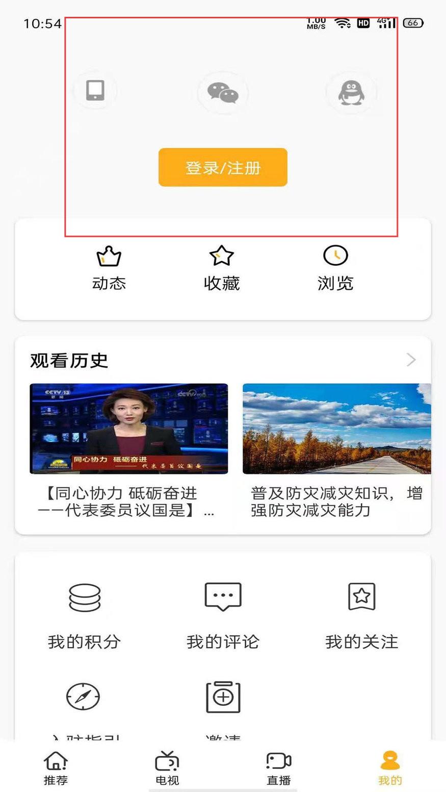 3、在我的頁面點登錄注冊選手機微信QQ方式登錄后查動態收藏瀏覽及觀看歷史。