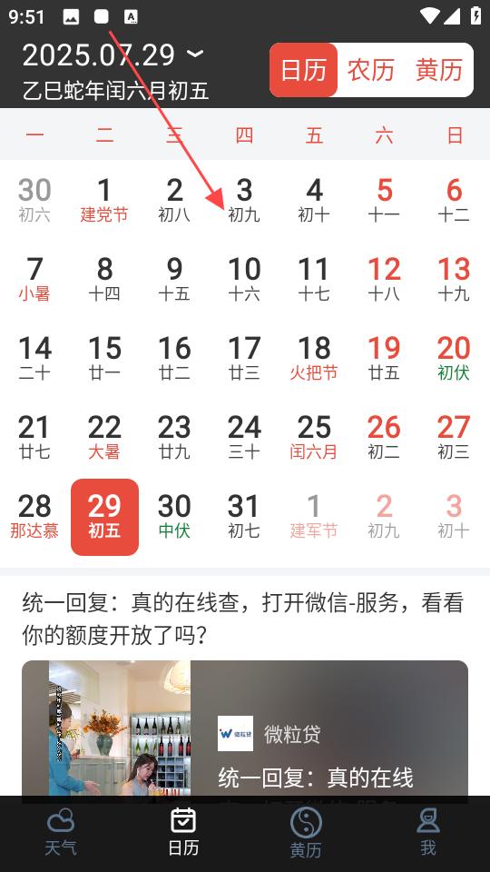2、日歷界面,顯示了2025年7月29日的日歷信息,包括公歷、農歷和黃歷,用戶可查看日期和節日信息。