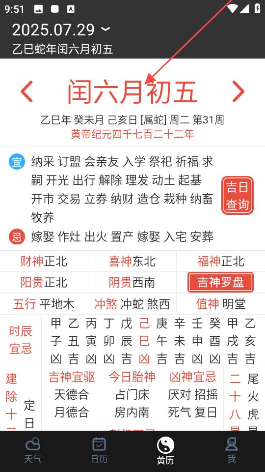 3、黃歷界面,顯示了2025年7月29日的黃歷信息,包括宜做和忌做的事情、財神方位、喜神方位等內容。