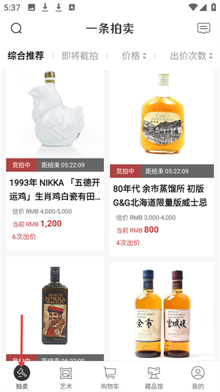 1、拍賣頁,展示1993年NIKKA生肖雞白瓷酒、80年代余市威士忌等拍品,標注估價、當前價、出價次數及競拍剩余時間。