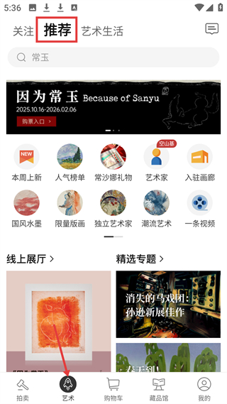 2、藝術頁有本周上新、人氣榜單等分類入口,還有線上展廳和精選專題,展示藝術展覽、藝術品等內容。