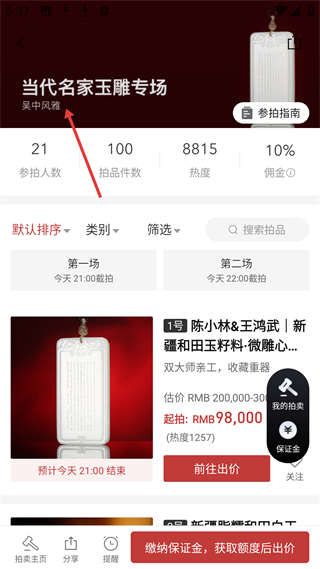 3、當代名家玉雕專場頁,展示參拍人數、拍品件數、熱度等,拍品如田玉籽料微雕心經牌,標注起拍價、估價及截拍時間。