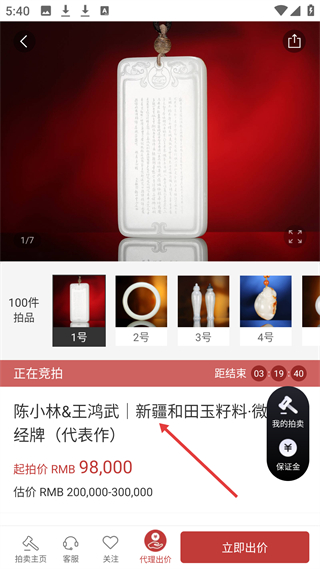 4、田玉籽料微雕心經牌詳情頁,展示拍品圖片、名稱、起拍價、估價、競拍剩余時間,可立即出價或選擇代理出價。