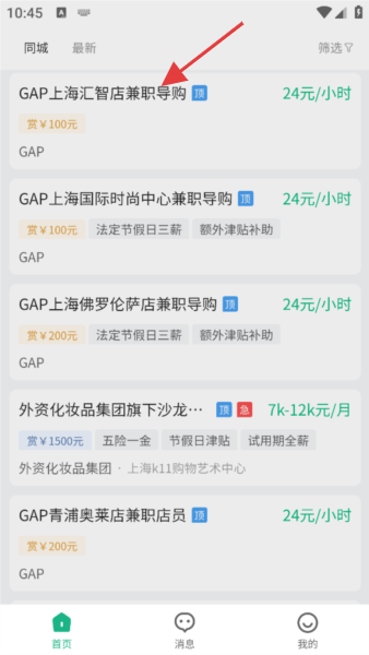 3、進入首頁能看到同城、最新兼職崗位,像GAP上海多家門店的兼職導購,薪資、補貼等信息清晰。