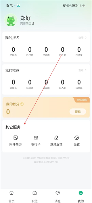 4、進入我的頁面查看我的報名我的推薦等數據,完善簡歷信息,還能使用附件簡歷銀行卡等其他服務功能,管理個人求職相關信息。