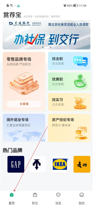 1、進入賞薦寶進入首頁,瀏覽零售品牌專場等求職板塊,了解平臺提供的崗位類型,點擊職位選項進入職位列表頁面,準備查看崗位信息。