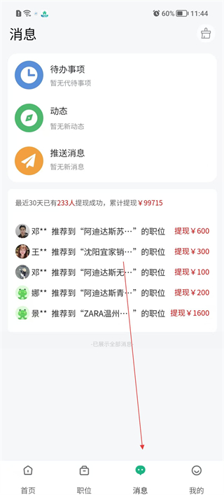 3、點擊底部導航欄的消息選項,進入消息頁面,查看待辦事項動態等內容,了解平臺推送的信息,掌握求職相關的通知。