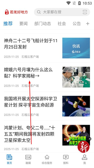 3、是專為若羌制作的融媒體移動平臺,平臺擁有新聞,融媒,爆料,服務等等板塊內容;