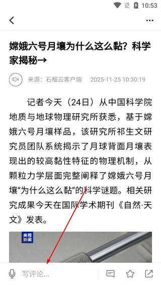 4、在詳情頁底部的評論輸入框填寫內容,點擊發送參與互動,也可使用收藏分享功能,對這篇資訊進行后續的管理與傳播。