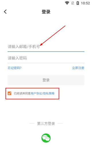 2、在對應輸入框填寫郵箱或手機號,再輸入設置好的密碼,勾選用戶協議與隱私政策選項,快速完成登錄。