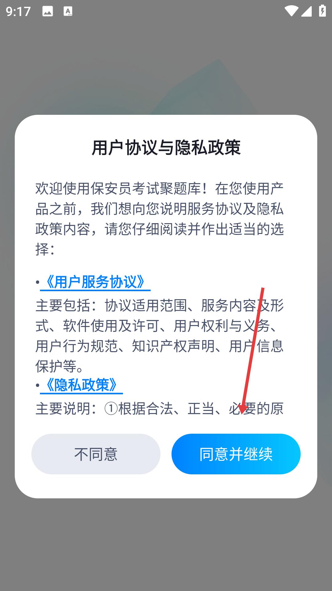 1、打開保安員考試聚題庫,閱讀提示后點擊同意,進入登錄頁,選一鍵或密碼登錄。
