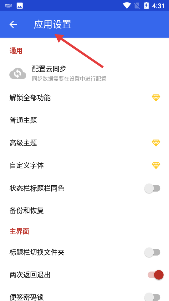 2、點擊應用設置頁面,分類呈現通用和主界面設置選項,從云同步配置到主題、字體自定義,功能豐富且實用。
