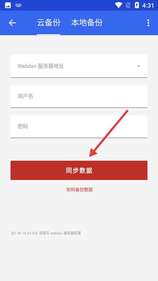 3、點擊云備份頁面,提供Webdav服務器相關輸入欄,明確同步數據操作按鈕,下方附帶備份指引,保障數據存儲安全。