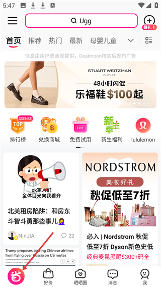 1、首頁搜索欄可搜Ugg有推薦、熱門等分類,展示Stuart Weitzman樂福鞋閃促等廣告,還有排行榜、兌換商城等功能入口。