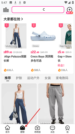2、好價頁面呈現大家都在搶的商品,如lululemon闊腿褲、Crocs洞洞鞋等,標注優惠價格與熱度,分護膚、運動戶外等推薦分類。