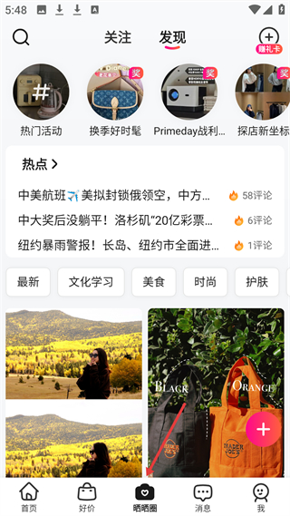 3、曬曬圈頁面有關注、發現板塊,有熱門活動、換季好時髦等話題,展示中美航班、紐約暴雨等熱點,還有美食時尚等內容分類。