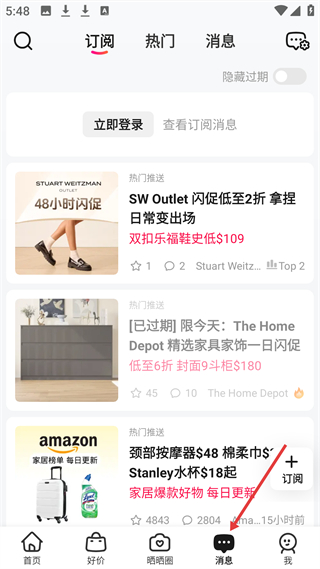 4、消息頁面分訂閱、熱門等,有Stuart Weitzman閃促、The Home Depot家具閃促等推送,可查看訂閱消息管理消息設置。