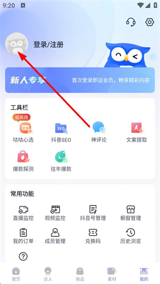 2、我的頁面中,點擊頭像區域會觸發登錄注冊流程,同時可查看工具欄里的咕咕心選抖音SEO等功能選項。