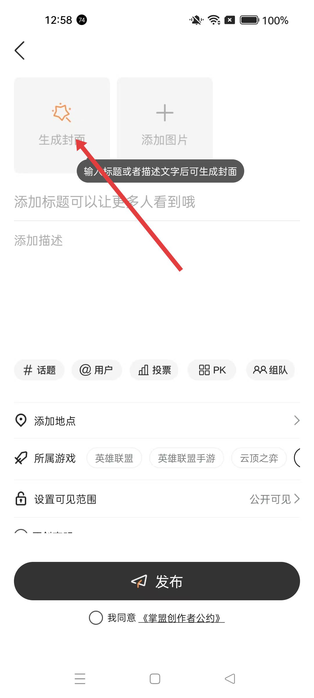 4、帖子編輯頁面,可生成封面、添加圖片、輸入標題和描述,還可添加話題等,編輯完成后點擊發布即可分享內容。
